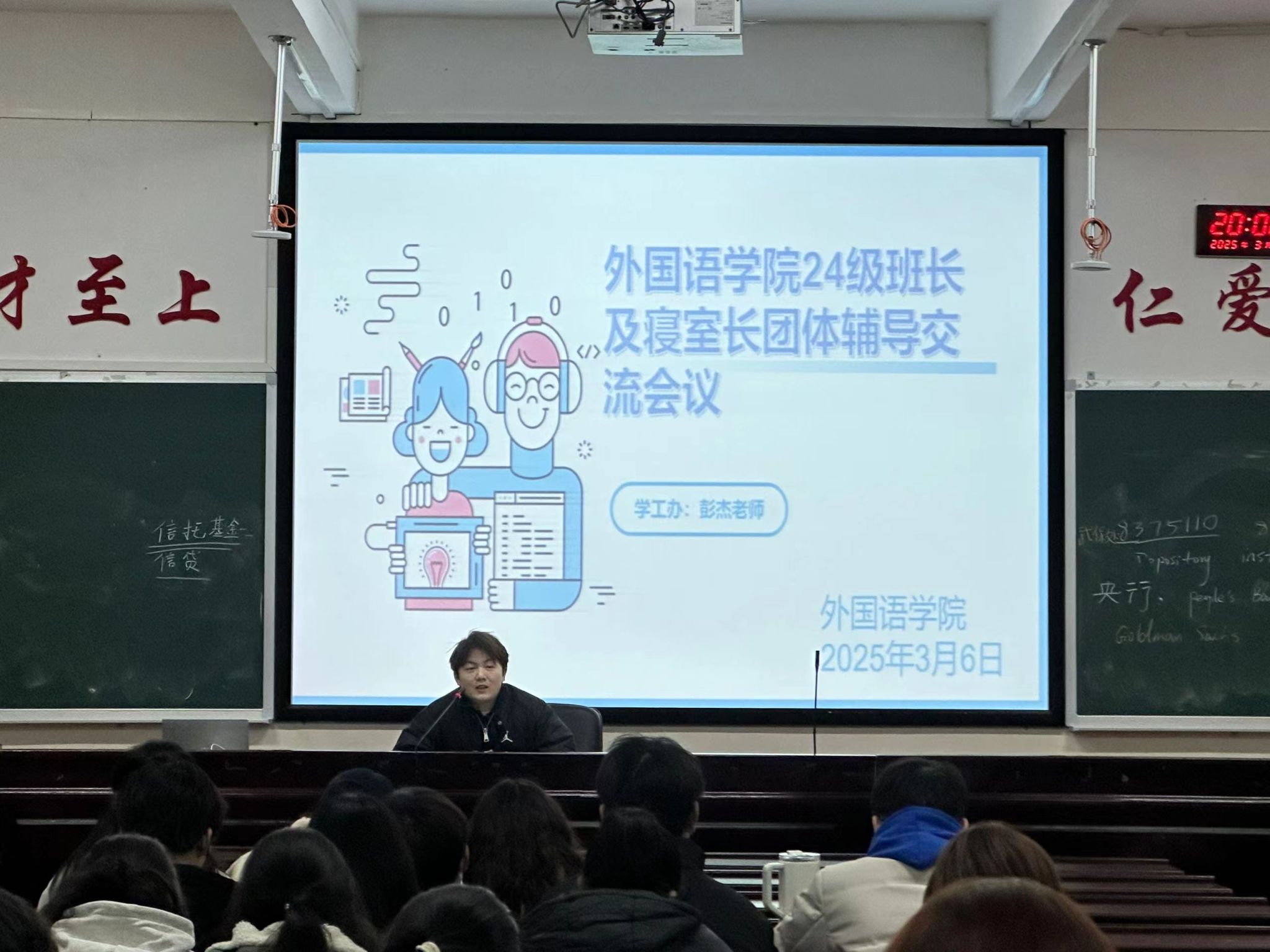 2025年3月6日20时,外国语学院在播馨楼406教室举行了24级班长及寝室长团体辅导交流会议,由学工办24级辅导员彭杰老师主讲。