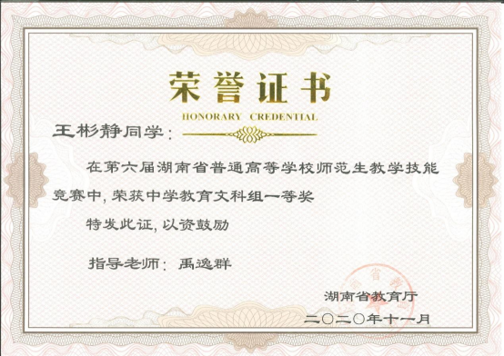 学生获奖风采:2020年湖南省普通高校第六届师范生教学技能竞赛中荣获文科组一等奖。