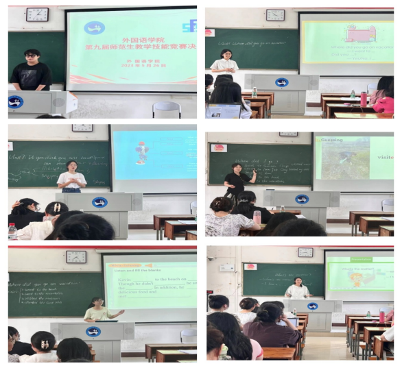 2023年5月26日下午,外国语学院2023年师范生课堂教学技能竞赛决赛在播馨楼303进行。此次决赛共有13位选手参赛,参赛选手来自英语专业2020级和2021级学生。竞赛共有教学设计、课件制作、片段教学三个环节,每位参赛选手竞赛满分为100分,其中教学设计30分,课件制作15分,片段教学55分(包含板书设计10分)。