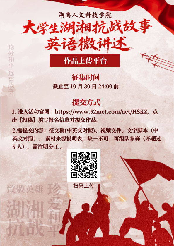 为纪念中国人民抗日战争暨世界反法西斯战争胜利80周年,深入贯彻落实习近平新时代中国特色社会主义思想和党的二十大精神,弘扬伟大抗战精神与爱国主义传统,2025年7月至10月,由ballbet贝博bb艾弗森教务处主办,外国语学院与湖湘文化海外传播研究中心共同承办的“大学生湖湘抗战故事英语微讲述”大赛顺利举行并圆满落幕。