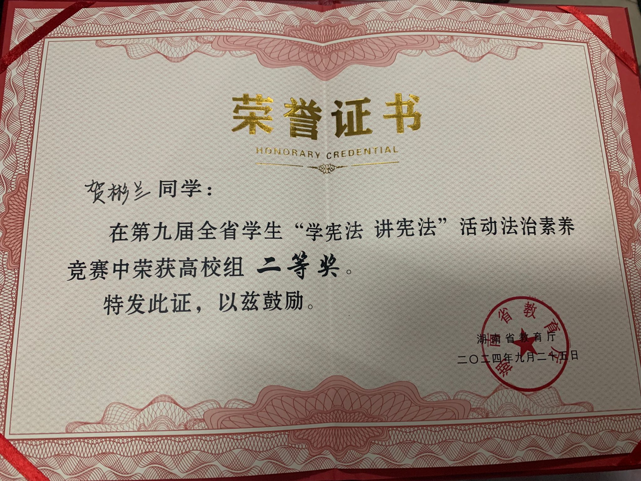 第九届全国学生“学宪法 讲宪法”活动高校组湖南赛区总决赛于2024年9月25日在湘潭大学圆满落幕。贝博法学院贺彬兰同学荣获“学宪法 讲宪法”活动法治素养比赛湖南省二等奖。