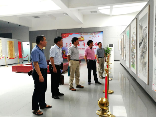 7月12日上午,校党委书记郭军、校长刘和云、党委副书记刘铁铭、副校长石潇纯、纪委书记杨鑫铨与宣传统战部、美术与设计学院相关负责人一行来到逸夫楼二楼展厅参观了“不忘初心,牢记使命”ballbet贝博bb艾弗森学习贯彻党的十九大精神书画展。