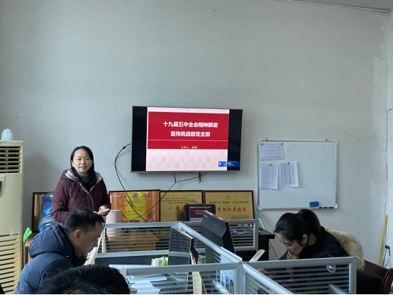 12月16日上午,宣传统战部党支部书记谢柳在明德楼515室上党课,为全体支部成员解读十九届五中全会精神。