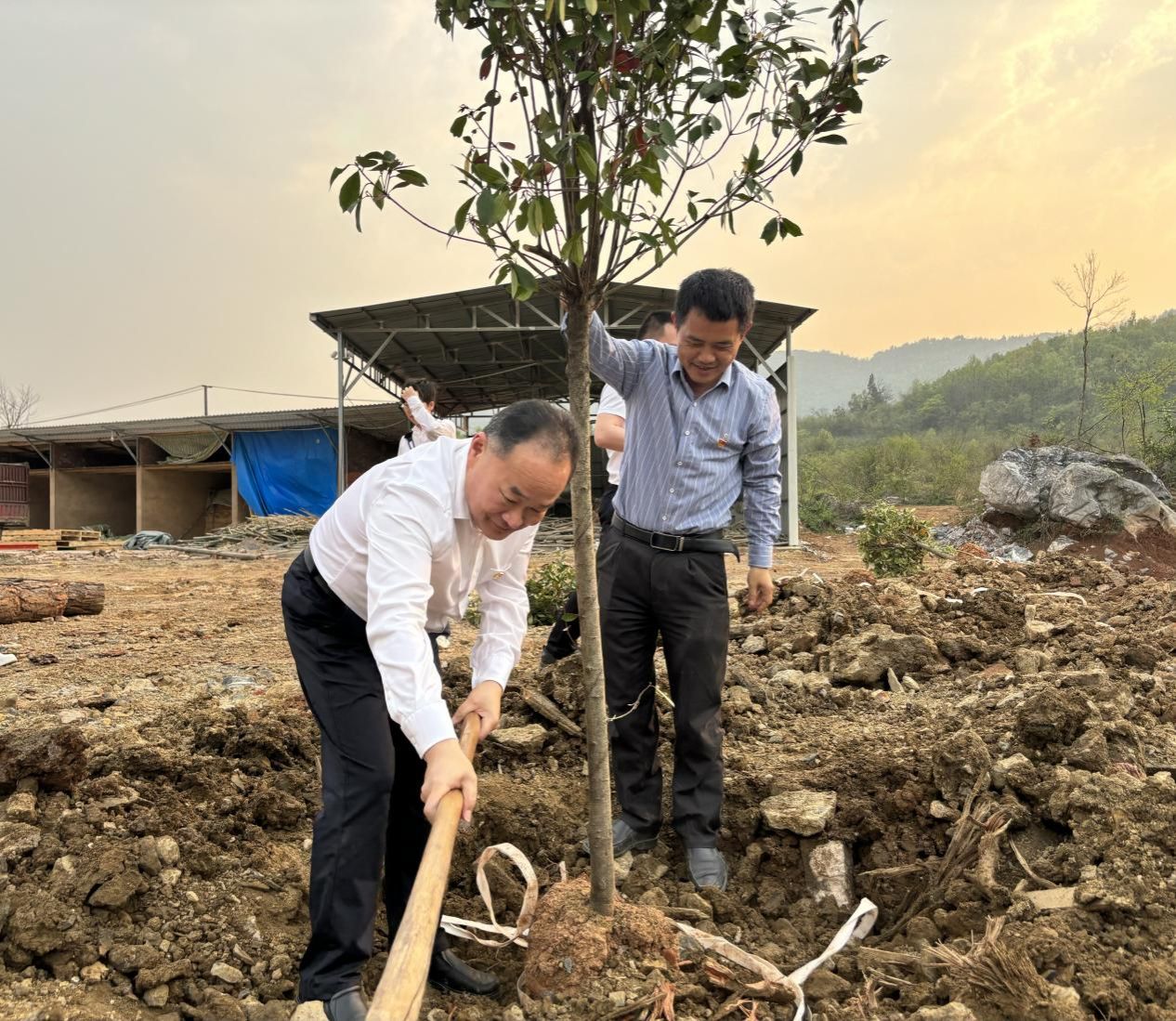在春意盎然的村企合作竹木加工厂附近,鲜红党旗与翠绿树苗交相辉映。党员们迅速投入到植树劳动中。大家分工明确,有的扶苗培土,有的提水浇灌,每个环节都井然有序,配合默契。党支部书记谢柳在活动中强调:“我们要以党建为引领,将绿色发展理念融入到生活中,发挥党员先锋模范作用,为建设美丽乡村贡献力量。”