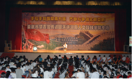 5月30日晚,由娄底市禁毒办、市禁毒协会、市慈善志愿者协会、市演讲艺术家协会联合组织的娄底市“手拉手共筑禁毒长城·齐参与争创文明娄底”禁毒宣传巡回演讲活动在贝博体育馆举行,号召全校师生向毒品宣战,向全社会呼吁“珍爱生命,拒绝毒品”。市禁毒协会会长肖新桃、市禁毒委副主任、禁毒办主任、贝博法制副校长朱青春、市禁毒委常务副主任、市禁毒支队支队长刘伟、市禁毒协会秘书长廖德民及贝博副校长刘铁峰出席活动。2015级全体学生及各学院分管学生工作副书记、全体辅导员、保卫学工全体干部职工4000余人聆听了演讲。