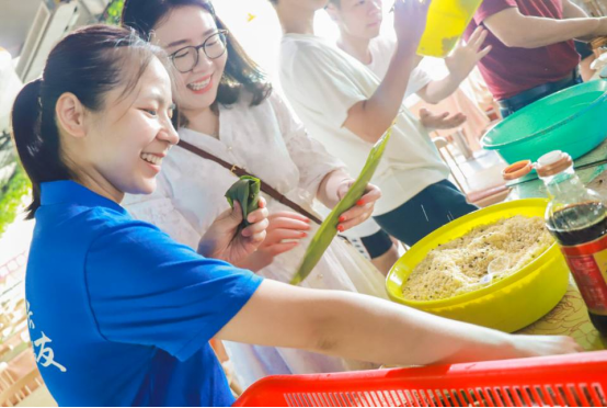 (老师们和同学们一起包粽子)