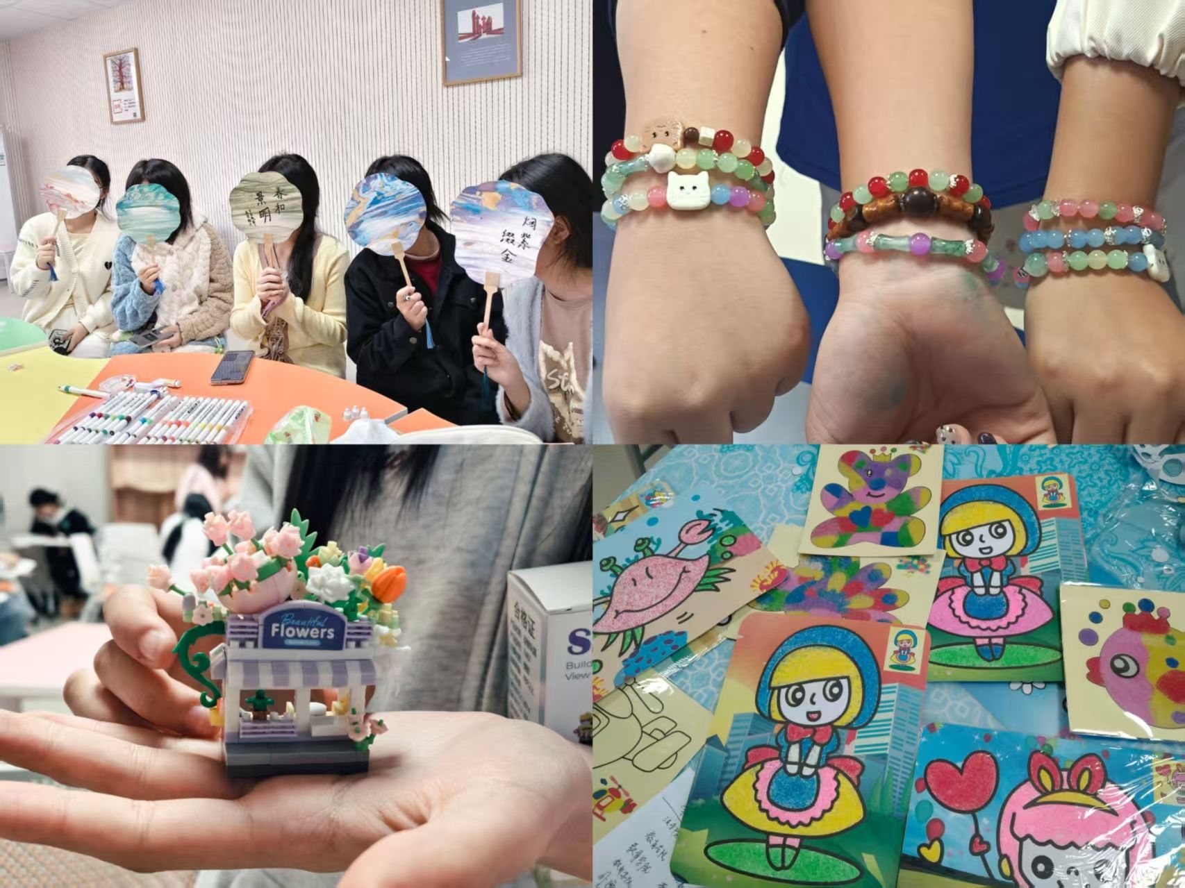 活动开始,工作人员向在场学生详细介绍了心理中心相关信息,帮助同学们深入了解学校的心理健康资源。随后进入趣味手工创作环节:“积木筑心”让同学们在自由创作中释放压力,用双手抚平心绪;“漆扇诉心”将流动的颜料与扇面结合,引导大家接纳不确定性,拥抱内心多样可能;“心域流沙”借助非语言的沙画创作,搭建起与自我情感对话的桥梁;“串个‘饰’界”,同学们精心挑选将各色珠子串联,设计出承载心情与寓意的独特作品。活动现场氛围轻松热烈,同学们从繁忙的学业中抽出时间在手工制作中找到一方滋润心灵的净土。