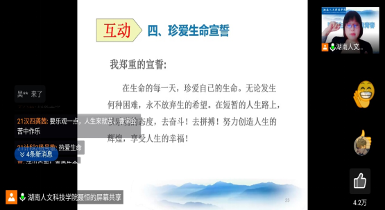 讲座伊始,聂恒老师从生命的定义和生命的三重属性、当代大学生存在的生命观偏差以及大学生自我生命教育三个方面引导学生认识生命、感恩生命和敬畏生命。她强调了生命的非逆转性、非再生性等特点,阐述了自己对生命的感悟,引发了学生对树立正确生命价值观的思考。聂恒老师运用生动案例,讲述了新冠疫情爆发时医护人员依然冲向前线的故事,指出大学生不仅要对自己的生命负责,还要肩负起对他人、对社会、对自然负责的使命。最后,讲座在师生们庄重的“珍爱生命宣誓”仪式中结束。