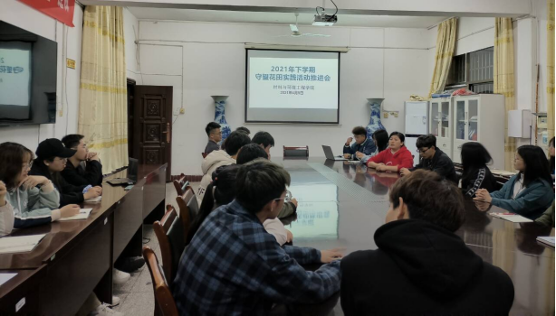 2021年4月9日晚9:30,材环院学生分会生活督察部、青工部在多闻楼410会议室组织召开了2021年上学期守望花田实践活动工作部署会议,2020级全体班长、文建委员、以及学生分会的部分干部参会,会议同时邀请了学院分管守望花田实践活动负责人陈佩君老师,会议由学生干部王瑞声主持。