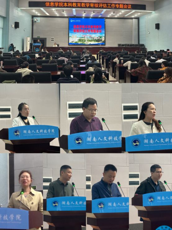 各教研室主任结合专业特色汇报迎评举措。网络工程专业李曾妍号召教师以高度责任感投入评估;电子信息工程专业刘湛分析课程难度与学业预警关联,提出深化校企合作服务湖南“三高四新”战略;软件工程专业肖敏雷建议应对AI技术挑战,改革程序设计课程评价机制;人工智能专业曾增日立足新专业定位,提出构建产教融合的AI人才培养体系。教师代表陈雷、龙海、刘懿从一线视角分享感悟,陈雷以“十年育人,静待花开”的故事呼吁教师坚守初心;龙海强调“少抱怨、多担当”,凝聚迎评合力;刘懿提出通信工程专业需加强理论与实践衔接,探索前沿技术融入教学。