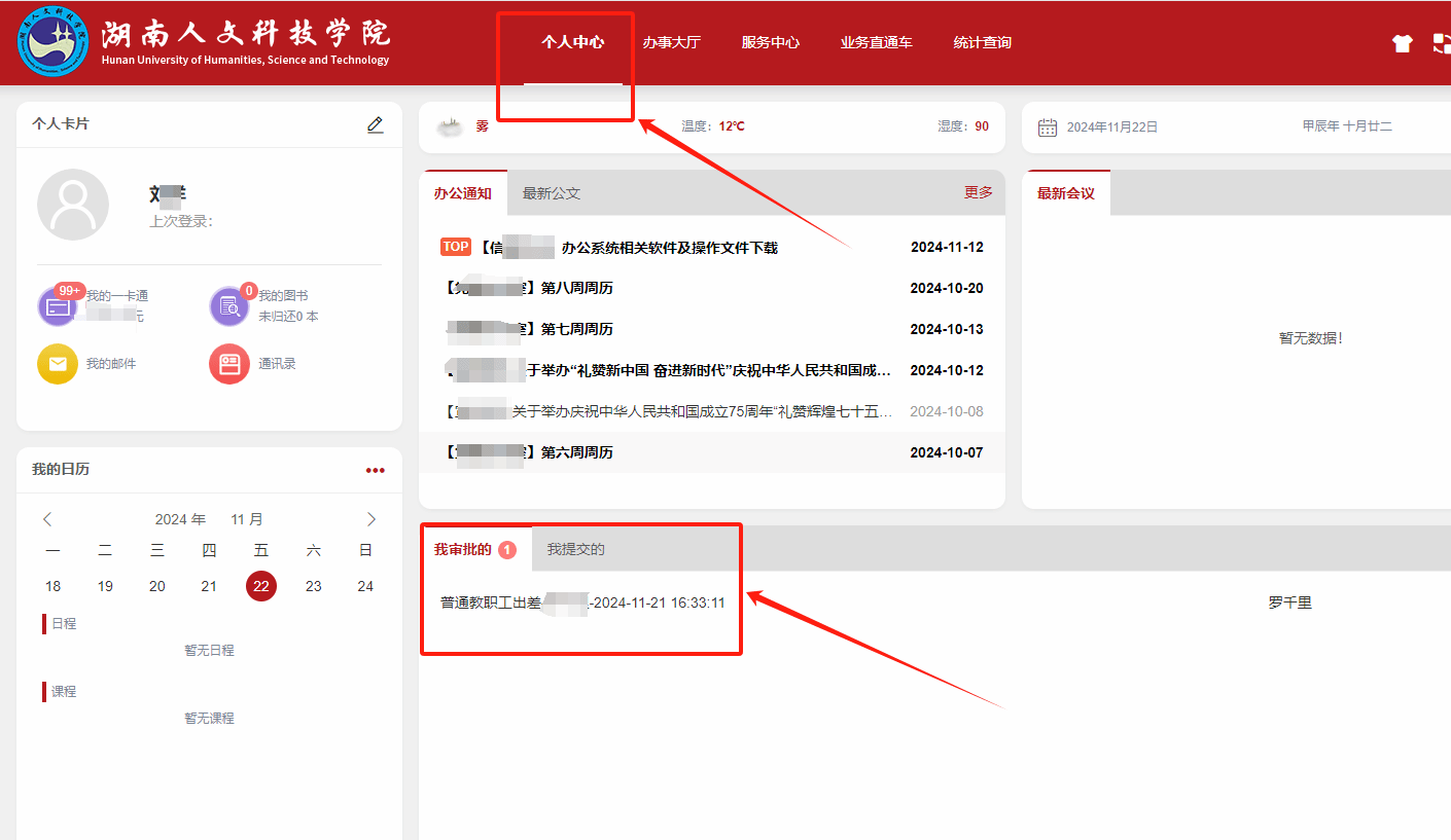 三、进入新智慧校园界面,在“个人中心”—“我审批的”,选择待办流程