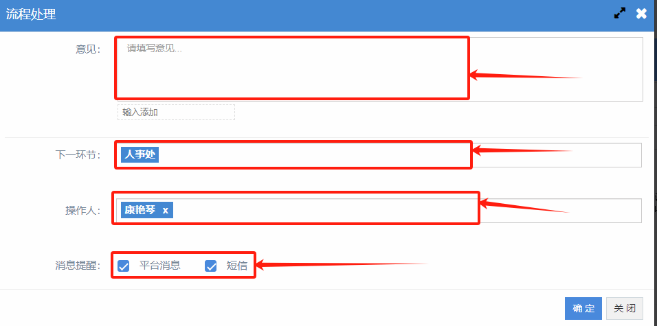 五、点击“提交”后,在弹出页面选择“下一环节”和“操作人”,填写“意见”后,点“确定按钮”。