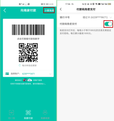 1、进入付款码右上角小额免费密-选择需开通的银行卡