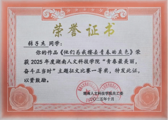 文学院2025级网络与新媒体1班张子杰同学的作品《他们为我擦去青春的灰色》斩获全校第一名。这篇散文以细腻笔触勾勒出青春突遭重创后的绝望与救赎。最动人处在于转折处的温情——文学院书记、辅导员、班主任等用朴素的关怀刺破绝望的阴霾。那些看似平常的触碰与叮嘱,恰似星火点亮废墟,让少年在支离破碎中重新辨认出生命的温度。最终剪去长发写下“奋斗”的细节,完成了从灰色到彩色的涅槃,彰显困境中人性光辉的力量。据悉,张子杰同学于2025年10月加入娄底市作家协会,成为一名官方认可的文学新锐,已公开发表作品十余篇。文苑新蕾,竞相绽放,这股奔涌的青春力量,正谱写着学校未来璀璨的希望华章……