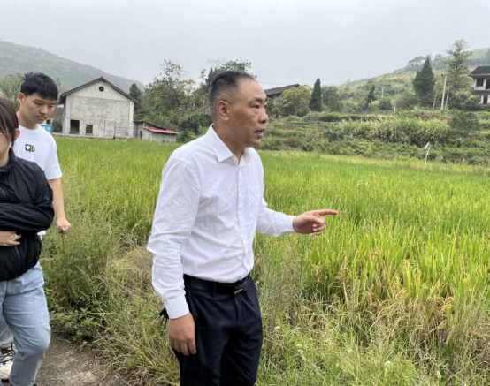 图2 罗育才教授为同学们讲解锡矿山的水稻种植