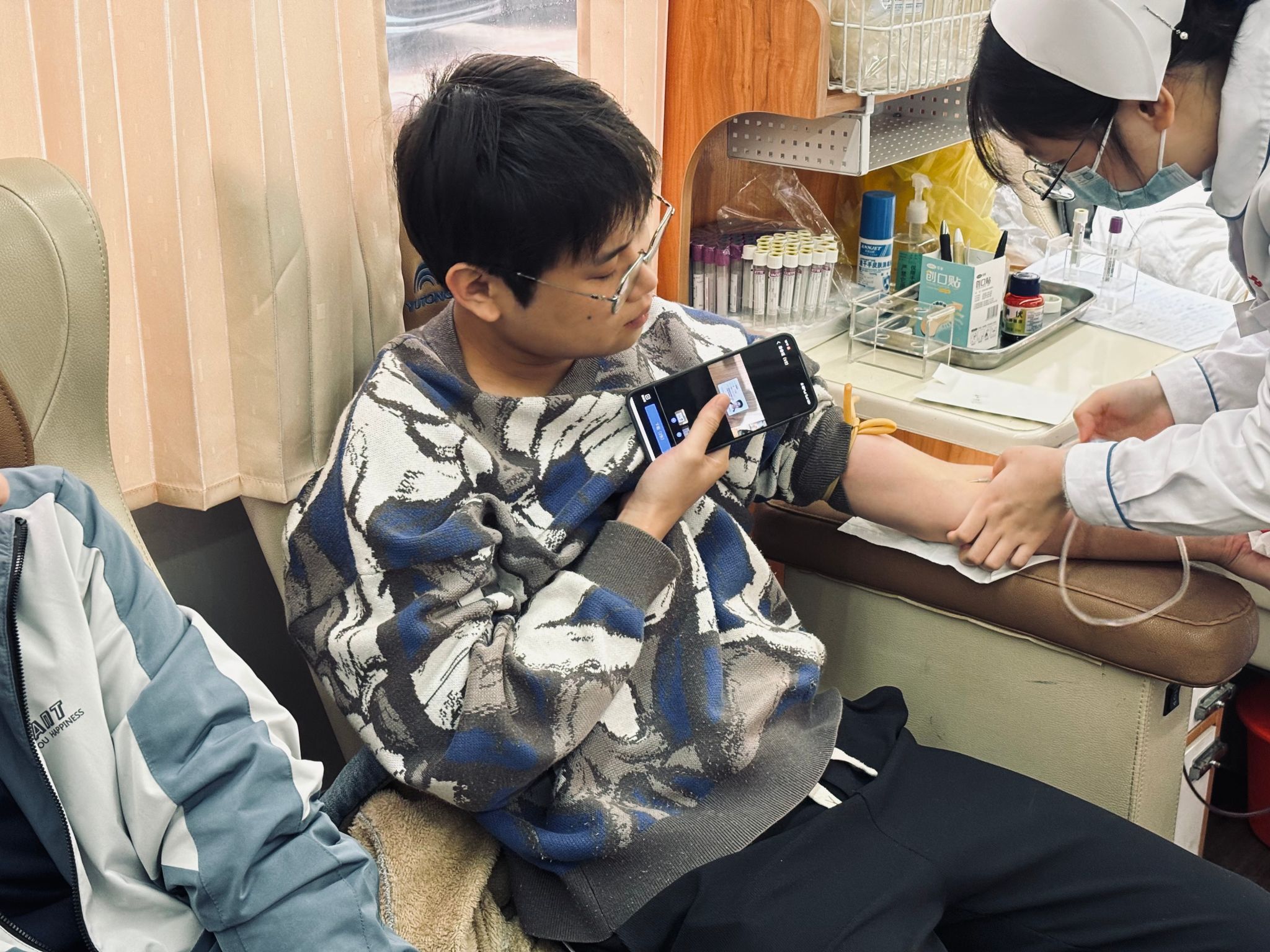 献血前,同学们进行了详细的填表及检测,以确定身体符合献血条件。随后,医护人员细心为同学们测量血压,并耐心讲解献血相关知识和注意事项。同学们勇敢地伸出了自己的臂膀,捐献自己宝贵血液。献血过程中,研究生部老师及同学始终陪伴在旁,密切关注着献血者的身体状况,确保整个献血过程的安全与顺利。