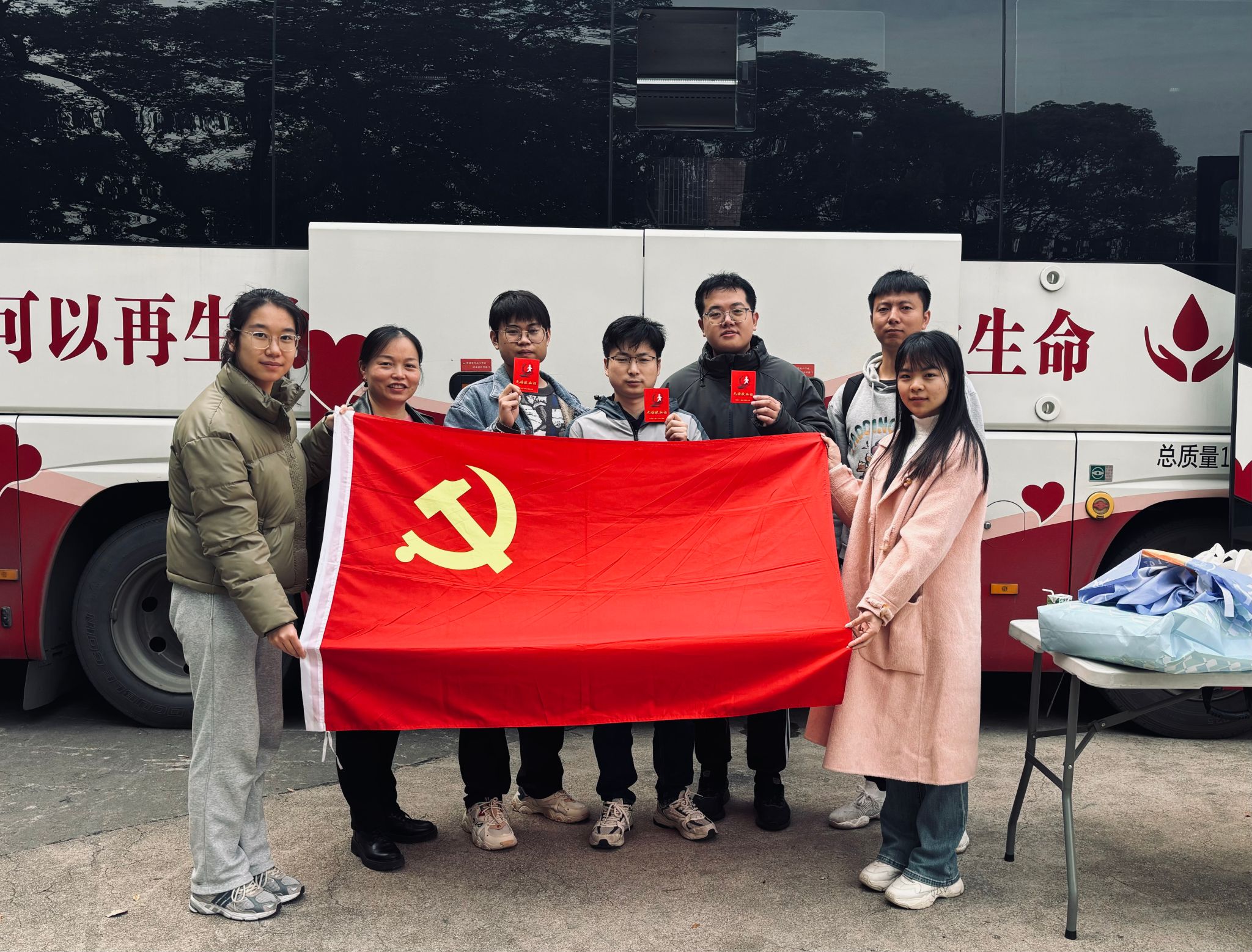 献血结束后,同学们手持献血证,脸上洋溢着骄傲的笑容。为纪念这一光荣时刻,大家手持院旗、党旗和团旗,站在献血车前合影留念。此次活动不仅体现了研究生的社会责任感,也彰显了新时代研究生的爱心与担当。
