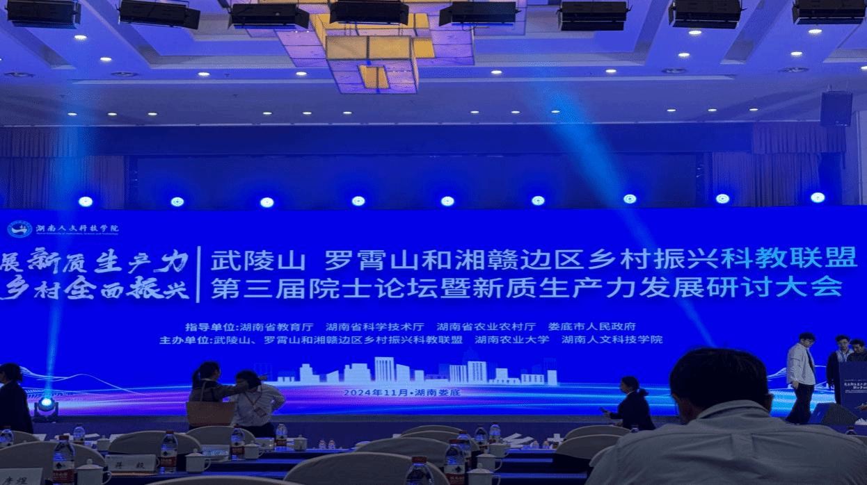 11月8-9日,“两山一区”乡村振兴科教联盟第三届院士论坛暨新质生产力发展研讨大会在娄底华天大酒店举行,会议聚焦于“发展新质生产力,助力乡村全面振兴”宏大议题。研究生教育教学部组织研究生导师和23级、24级研究生全程聆听,共享智慧盛宴。