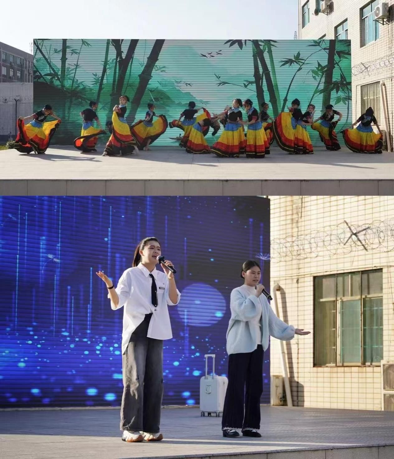 整场演出形式多样,内容丰富。演出开始前,监狱相关领导曾来院与学院领导,就演出具体事宜进行了深入而细致的讨论,希望可以选取具有一定艺术水平的音乐舞蹈艺术的作品呈现给观众。刘利连院长也表示,学院非常重视此次演出,既精选了学院优秀的师生完成本次活动,也挑选了格调高雅、内涵丰富、技术成熟的音乐舞蹈作品参加此次文艺汇演。演出当天,我院师生以歌曲、舞蹈、器乐演奏等多种艺术形式为现场带来一场文化盛宴。当演出开始时,服刑人员都睁大双眼,看向了舞台。当音乐舞蹈作品进入到他们的生活中时,有的服刑人员甚至感动哭了,表现出了更好的情绪、更强的同理心。“我们并非是培养艺术家,”刘院长说道,“而是在帮助每个人发现内心的声音,并用这种声音与自己、与他人、与世界建立更健康的连接。”当节目的旋律响起时,身体的舞动与心灵的蜕变同步发生。在这方特殊的空间里,音乐与舞蹈的作品不仅是艺术,更是通向理解、责任与希望的桥梁——每一次律动,都是对人性复元的坚定信念。