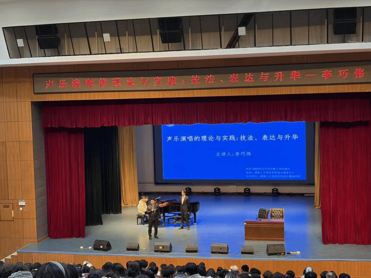 2025年11月12日晚上,长沙学院音乐学院院长李巧伟教授应邀赴ballbet贝博bb艾弗森音乐舞蹈学院,于音乐厅开展了《声乐演唱的理论与实践:技巧、表达与升华》声乐教学讲座,本次讲座由音乐舞蹈学院院长刘利连主持,音乐舞蹈学院师生代表踊跃参与。