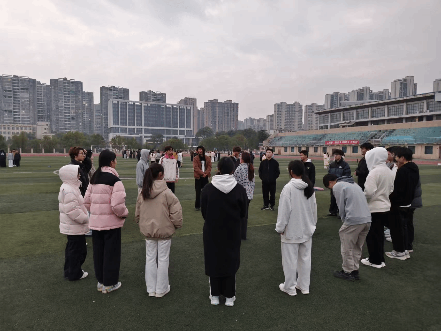 活动伊始,同学们严格遵照活动要求,在指定区域有序排队,全体同学以清爽干练的精神面貌,展现出蓬勃的青春朝气。在工作人员的统筹组织下,同各项素拓项目有序开展。。集体协作游戏环节设计巧妙、精彩纷呈,“你比划我猜”“接力传球”等项目轮番开展。活动中,同学们迅速分组、明确分工,心往一处想、劲往一处使。面对挑战,他们相互鼓励;出现失误,彼此及时安慰与指导;遇到难题,则共同商讨策略,在默契配合中逐一攻克。田径场上欢呼声、喝彩声此起彼伏,同学们全情投入,脸上洋溢着青春的欢笑,充分展现了团结协作、奋勇争先的优良风貌。整个活动现场秩序井然,始终洋溢着认真投入、互助友爱的热烈氛围。