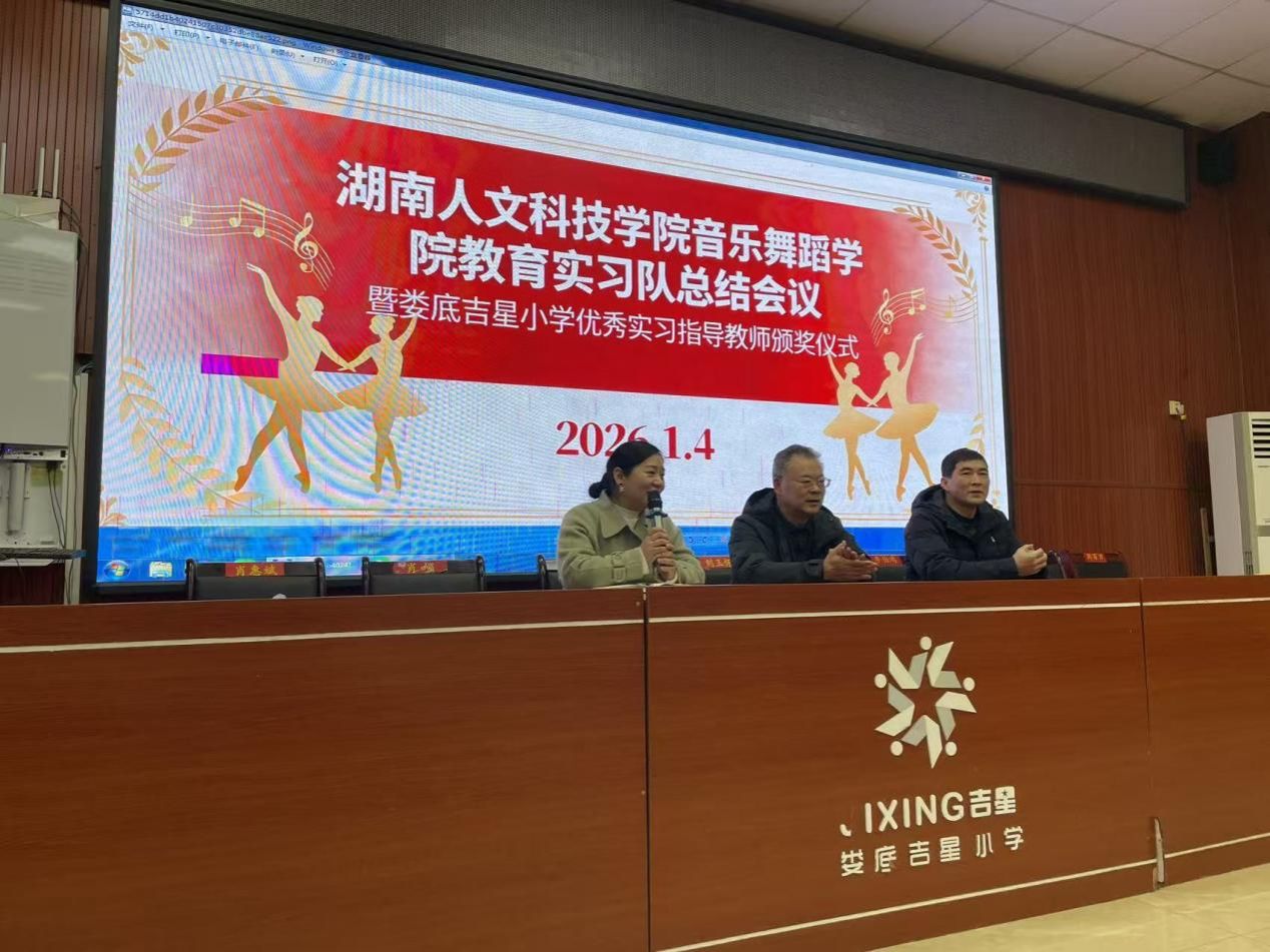 2026年1月4日下午4时,ballbet贝博bb艾弗森音乐舞蹈学院在娄底市吉星小学隆重举行教育实习总结会议暨优秀实习指导教师颁奖仪式。学院教学副院长颜春英副教授、实习带队教师刘玲博士、吉星小学刘玉怀书记、李伯雄校长、肖飞兰副校长、颜彪副校长、教育实习组长亢景兹老师及全体实习指导教师,与音乐舞蹈学院14名大四实习生共同参与了本次活动,为一段历时四个半月的教育实践之旅画上圆满句号。