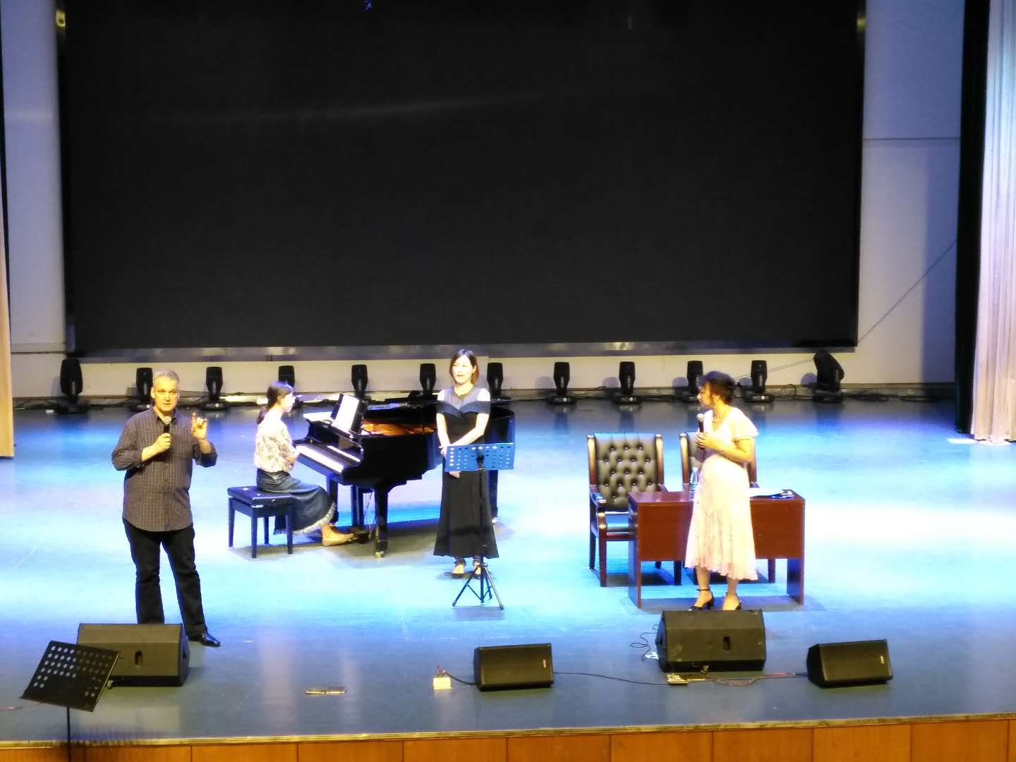 通过贝博国际合作与交流中心的牵线搭桥,6月6日,英国巴斯斯巴大学音乐学院院长MARK LANGLE一行三人来我院访问交流,并就双方合作办学进行洽谈,活动分为两个阶段,6日上午十点,在逸夫楼音乐厅,Mark院长面向我院声乐教师和音乐学专业所有学生上了一堂声乐交流课,活动由音舞学院副院长李旭开主持,我院三位声乐教师为配合上课进行了示范演唱,mark院长就声乐发声、作品处理和舞台表演等方面,进行了详细的讲解,精彩的讲解引起台下师生的阵阵掌声。