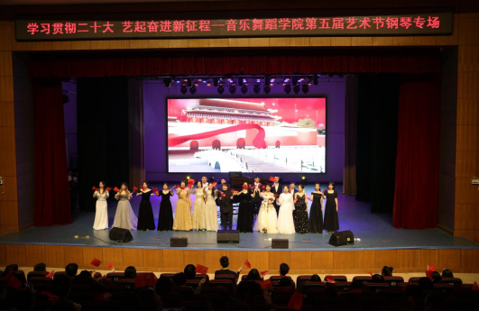 为深入学习贯彻党的二十大精神,全面推进课程思政建设,激发学生的学习积极性,提升舞台实践能力,11月25日晚在逸夫楼音乐厅成功举办“学习贯彻二十大,“艺”起奋进新征程”音乐舞蹈学院第五届艺术节钢琴教学成果展演。音乐舞蹈学院院长周邦春、书记刘纲华、副院长吴扎拉.涛、刘利连、副书记邓莉立出席活动现场,学院部分师生代表观看了本场展演。
