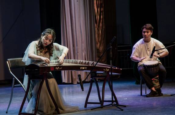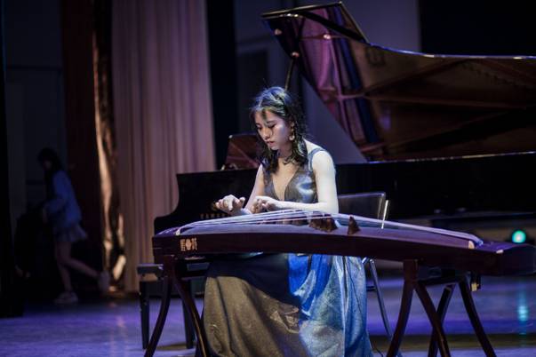 首先上场的是涂慧同学的独奏《晓雾》,优美的旋律一出来就瞬间抓住了观众的注意力,通过演奏的方式,引起听众对京城生活情调的联想,幻想出一幅朦胧,飘渺的晨雾美景。而后又为观众带来了一曲《溟山》,将古筝和鼓伴者阮兆东完美配合,使得曲子在演奏上有了一种新的突破,一曲结束后,赢得了观众的阵阵掌声,将气氛推至高潮。