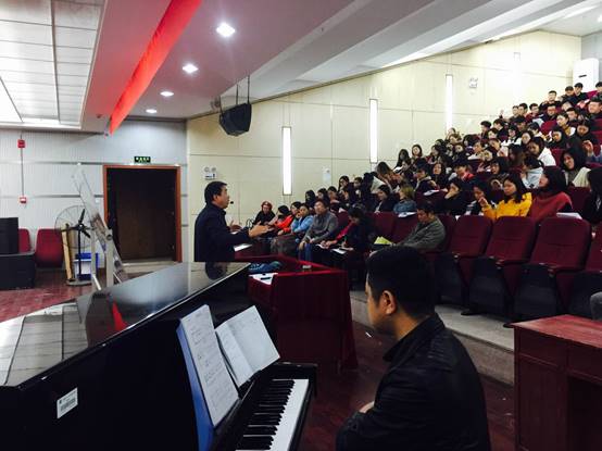 为进一步培养学生对合唱艺术的兴趣,普及合唱指挥专业知识,提升校园文化内涵,增强集体凝聚力,11月14日晚7:30分,由音乐舞蹈学院党总支书记周邦春老师主讲的“感受合唱魅力,提升指挥技能——指挥动作中矛盾的对立于统一”合唱指挥学术讲座在逸夫楼小排练厅举行。此次讲座由音乐舞蹈学院理论教研室主办,学校督导团成员、音乐舞蹈学院部分老师、2016级音乐学专业全体学生共计300余人聆听了讲座。