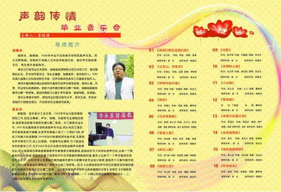 由贝博音乐舞蹈学院院长谢坚强作曲的《南岳山歌》娓娓动听,颇具当地的山歌风情。接下来在欢快的节奏中,观众欣赏了《我的祖国妈妈》、《国旗之恋》、《乌苏里船歌》,歌声清脆悦耳,扣人心弦。《草原之夜》、《多情的土地》以其典雅舒适的歌声唱出了想念,唱出了深情;具有藏族音乐风格的《来香巴拉看太阳》唤起观众无限美好想象;而《老师,我想你》高亢悠扬,铿锵有力,一次次将晚会的气氛带向高潮,掌声不断。晚会以全体演员向所有老师鞠躬致谢的形式落幕。