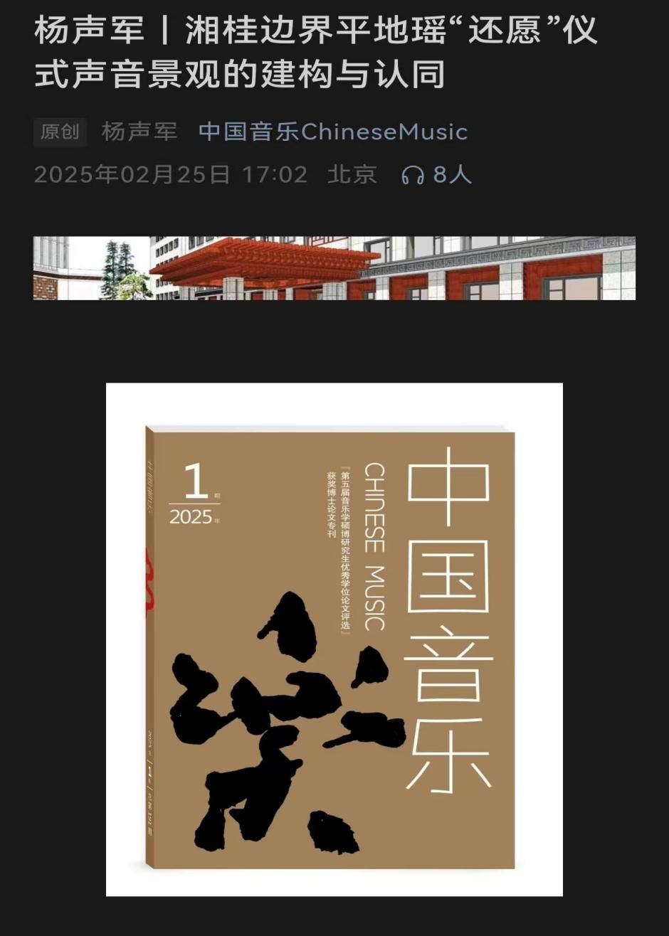 近日,贝博音乐舞蹈学院杨声军博士撰写的论文《湘桂边界平地瑶“还愿”仪式声音景观的建构与认同》发表于《中国音乐》(2025年第一期)。《中国音乐》为中国音乐学院主办的期刊,为“中文社会科学引文索引(CSSCI)”,北京大学《中文核心期刊总览》,《中国人文社会科学期刊AMI综合评价报告》艺术类核心期刊,属于音乐类顶级期刊。