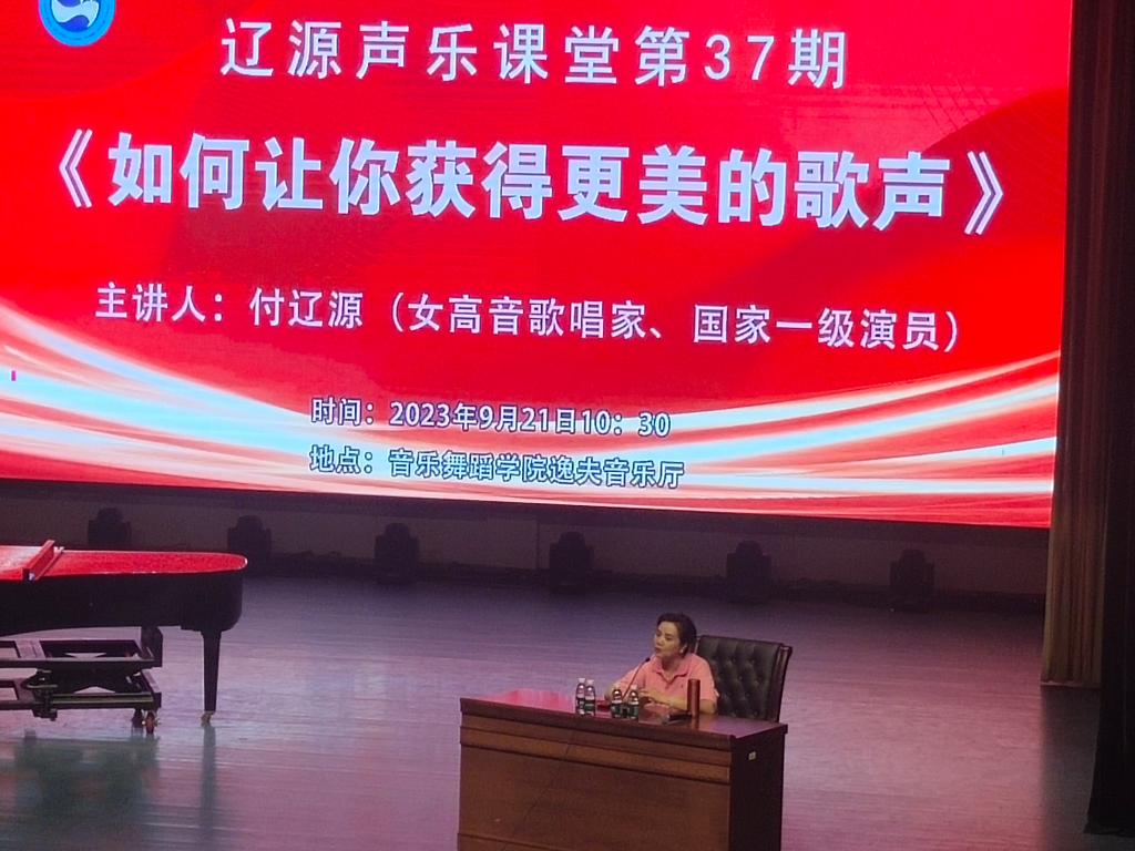 2023年9月21日上午,国家一级演员、女高音歌唱家、湖南省音乐家协会副主席付辽源来我院开展“辽源声乐课堂第37期——《如何让你获得更美的歌声》”学术讲座。音乐舞蹈学院声乐教研室的老师们和全院新生参加了此次讲座。
