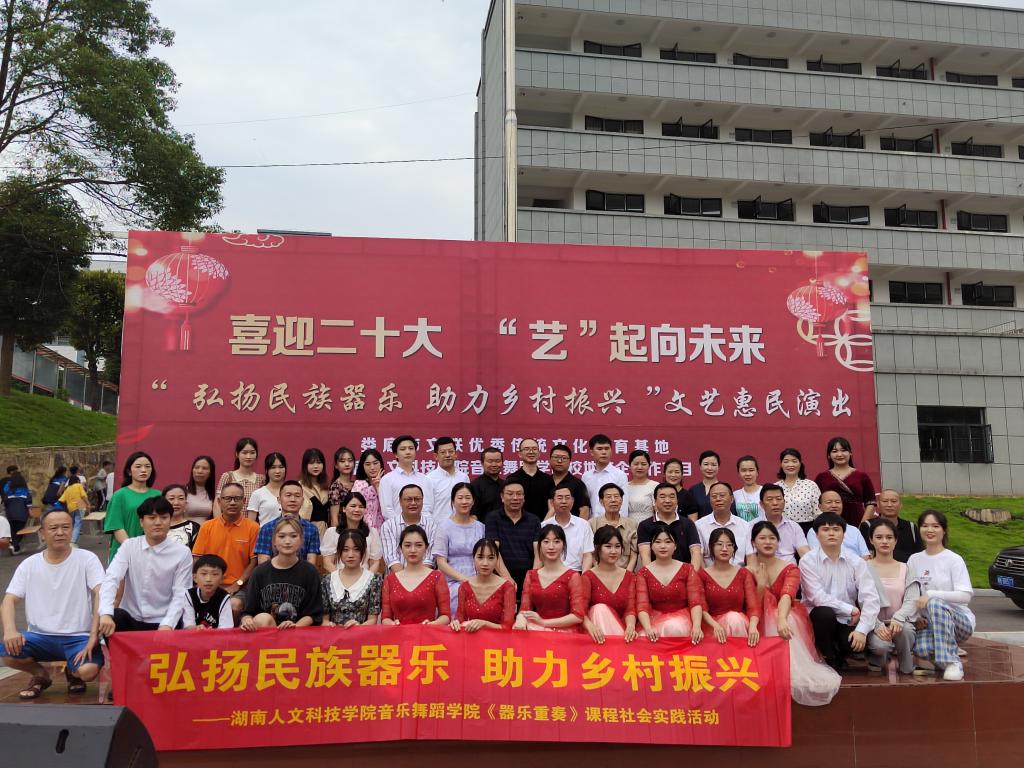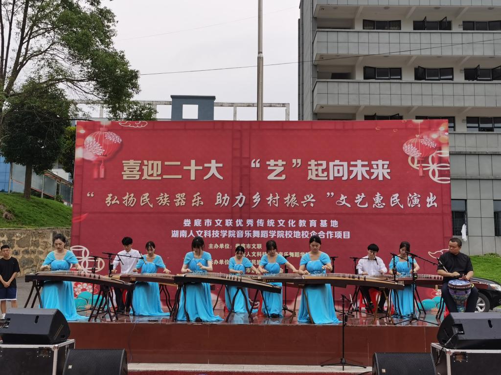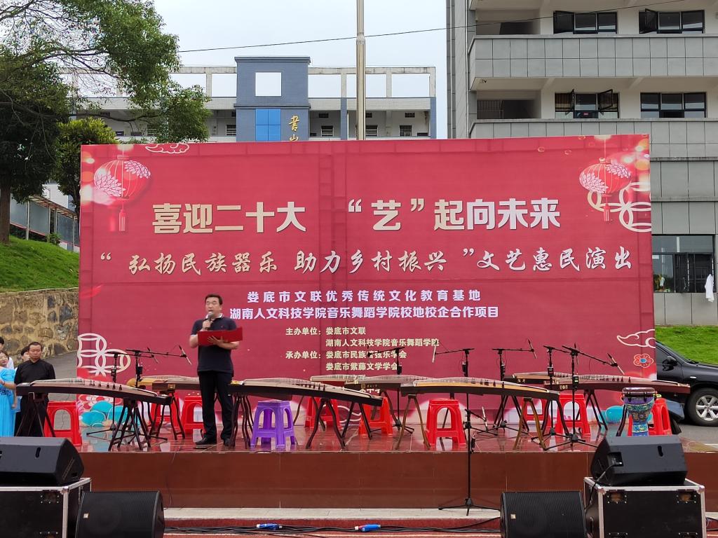 为弘扬民族音乐文化,助力乡村振兴,推动优秀传统文化进校园,610日下午,娄底市文联携手我院在市文联优秀传统文化教育基地(娄星区水洞底镇新禾中学)举办“喜迎二十大 ‘艺’起向未来”——“弘扬民族器乐 助力乡村振兴”文艺惠民演出活动,这也是音乐舞蹈学院省级一流课程《器乐重奏》(古筝)建设的阶段性成果展示。原娄底地区人大工作委员会副主任陈怀玉,市文联党组书记、主席杨九有,娄星区宣传部副部长谭新才,娄星区教育局局长王晖,ballbet贝博bb艾弗森音乐舞蹈学院院长周邦春、副院长刘利连等领导参加。