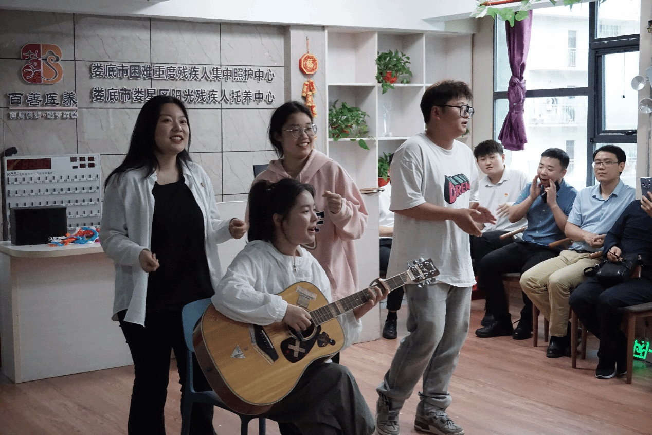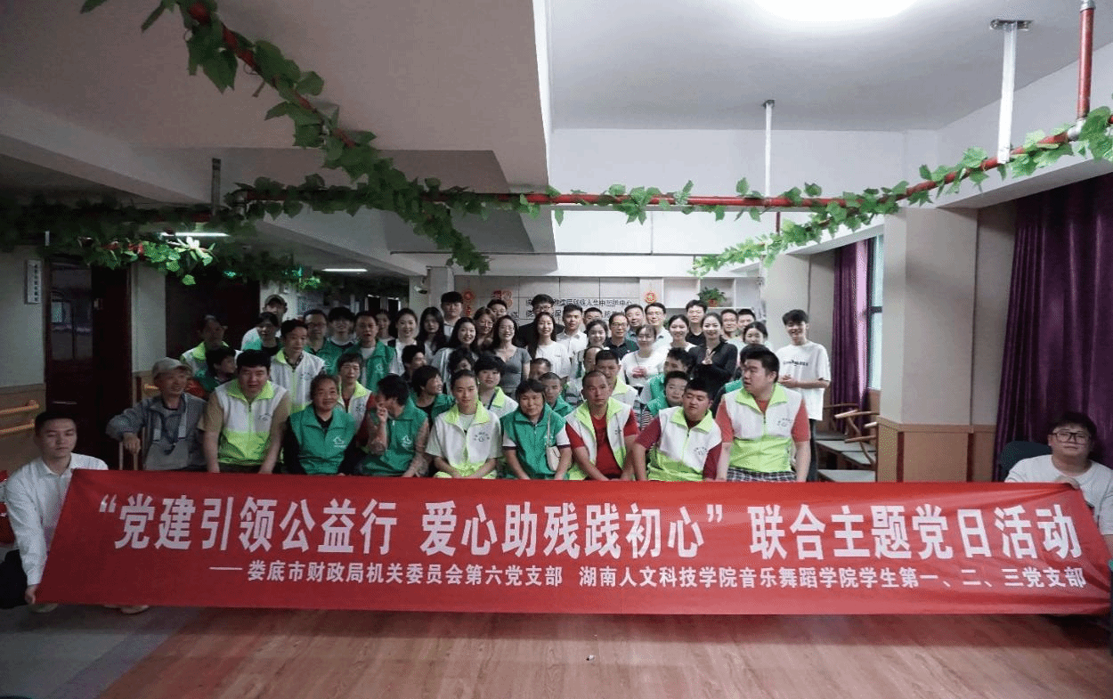 2024年5月31日下午,ballbet贝博bb艾弗森音乐舞蹈学院学生第一、二、三党支部在第三党支部书记朱璐老师的带领下来到娄底市娄星区阳光残疾人托养中心,与娄底市财政局机关委员会第六党支部共同看望正在接受康复治疗的残障人,开展“党建引领公益行,爱心助残践初心”主题党日活动,为他们送去关心和慰问。