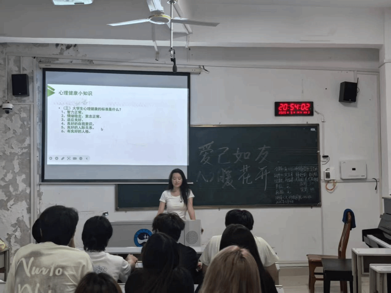为积极响应湖南省高校心理卫生知识科普周活动,切实提升学生心理健康素养,引导学生学会关爱自我、增强心理韧性,音乐舞蹈学院于2025年5月14日晚在逸夫楼组织开展“爱己如友,心暖花开”心理主题班会,24级全体学生参加。此次活动以积极心理学理念为指引,旨在帮助学生正确认识自我、悦纳自我,营造温暖和谐的校园心理氛围。