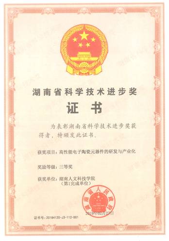由贝博为第一完成单位,湖南省美程陶瓷科技有限公司和湖南省新化县长江电子有限责任公司联合申报的《高性能电子陶瓷元器件的研发与产业化》项目(主要完成人:曾正春、彭秧锡、陈占军、方豪杰、文瑾、胡传跃、贺亦文、胡继林、田修营、钟洪彬、郭军),经湖南省科学技术进步奖评审委员会评审,省科学技术奖励委员会审定,省政府批准,荣获湖南省科技进步三等奖。