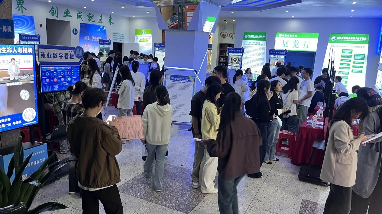 本场活动现场邀请了新能源、教育、金融、制造、文化传媒等16家优质企业参加,提供349个就业岗位。求职现场火爆,线上+线下投递简历215份,初步达成就业意向156人。现场同步开展直播带岗活动,观看量2146人次,浏览量3700次。本场活动推行“一企一机”智能招聘模式,用AI职播机全景展示企业环境,搭配AI交互机、智能一体机、数据看板、直播投放机等设备,让求职者扫码投送后即可实现精准匹配,将传统招聘中“简历筛选-初面沟通”的周期从数天压缩至几小时。这种“数字化工具+本地化场景”的结合,大大提升了企业和高校毕业生的匹配效率。