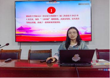 本次政治学习由文学院学生第二党支部舒小苡同志担任主讲人,围绕湖南省十四届人大三次会议”“省政协十三届三次会议内容,针对“三高四新”战略深化、高质量发展、民生改善等核心议题,展开了详细解读。同时,舒小苡同志还呈列出2024-2025年查处的违反中央八项规定精神的典型案例,号召学生党员们时时刻刻保持赶考的清醒,以钉钉子精神纠治四风