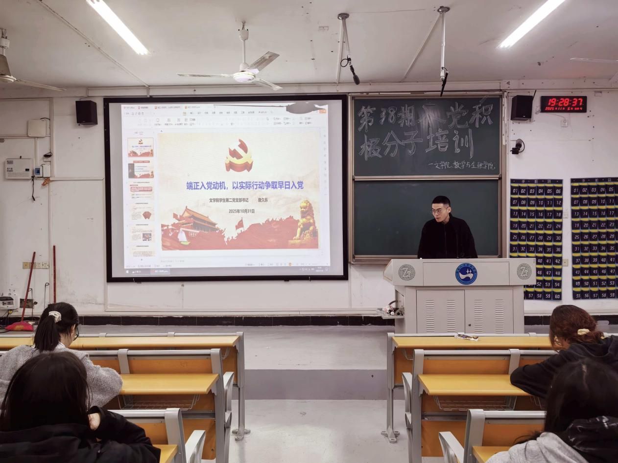 为帮助入党积极分子明晰入党要求、校准思想航向、筑牢信仰之基,引导其以纯正动机和务实行动向党组织靠拢,2025年11月6日,文学院学生第二党支部书记唐久乐以“端正入党动机,以实际行动争取早日入党”为题,为入党积极分子讲授专题课程。