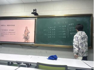下午四点,“互助磨课小组”的活动准时开始。在提前预约的专门用作“磨课室”的教室里,实习队员夏子星率先进行模拟授课,课程为《饮酒(其五)》。他按照正式上课的流程,从导入、新授到练习、总结,完整呈现了40分钟的教学过程。带队老师和其他队员则坐在“学生”座位上,一边认真听课记笔记,一边观察课堂节奏、互动设计等细节。授课结束后,大家立即展开评课,“导入环节可以更贴近生活,吸引学生兴趣”“诗句讲解要注意引导学生自主思考”“对诗词主题的讲解还需更加详尽”……大家直言不讳地提出意见,进行模拟授课的队员则一一记录,并不时与大家探讨改进方案。黄老师也根据听课过程中所做的笔录,首先在整体上进行了肯定,然后提出了几点意见,其中包括PPT制作上的瑕疵,对重难点字词的讲解不够透彻的问题等等。接着黄老师前往其他录播室听课指导,剩下的队员也依次进行了模拟授课,并与小组成员就PPT的内容、课堂节奏、重难点知识讲授方式等问题进行了讨论。
