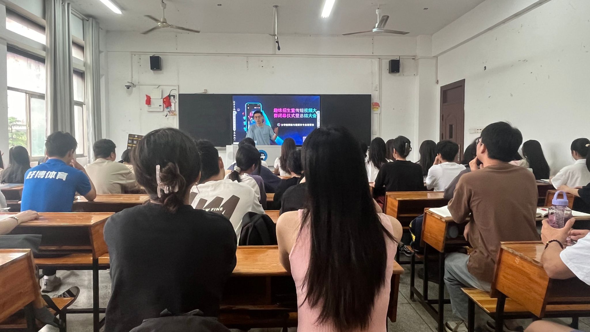 首先,唐久乐老师介绍了本次大赛开展以来的一些基本情况,并播放了部分优秀作品。本次大赛的同学们用本次比赛以“光影传情,静候君来”为主题,历时近1个多月,各队围绕学院招生工作来进行短视频制作和账号运营。学生从分组、筹备、摄制、上传到评选,学生们积极参与、创意百出。同学们制作的短视频类型多样,或展示学院学校的美丽环境,或以幽默诙谐的方式来增加视频热度,又或以学院专业为背景进行剧本创作,充分展现了网媒学子的创新热情和创造活力。以各队最终视频点赞量为标准,选出了一二三等奖。
