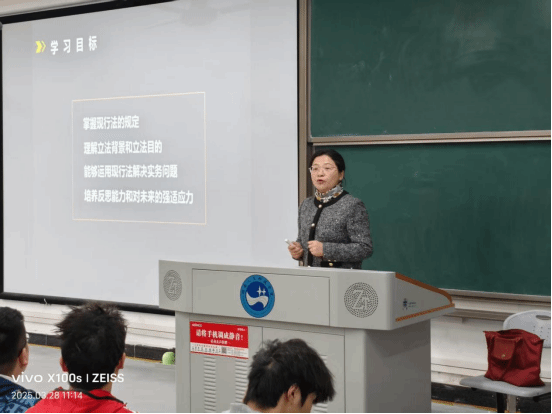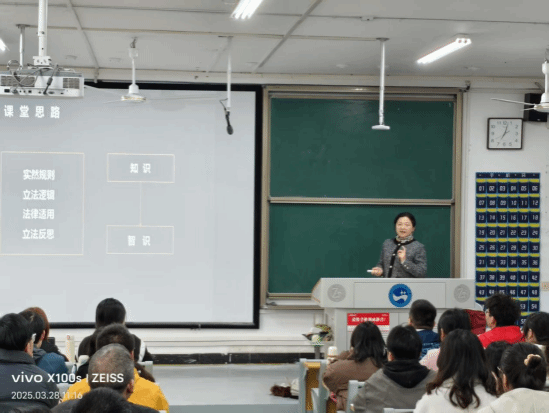 为深化教育教学改革,提升教师教学能力,3月28日,我院会同法学院开展了一场以提升课堂教学质量为目的的名师示范课,吸引了两个学院百余名师生参与。本次课程由湘潭大学王霞教授(博士生导师,湘潭大学教学名师、教学督导团专家,省级线上精品课程、省级混合式一流课程主持人,《经视说法》长期特邀嘉宾)应邀主讲。