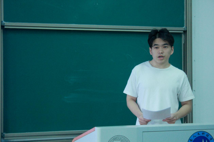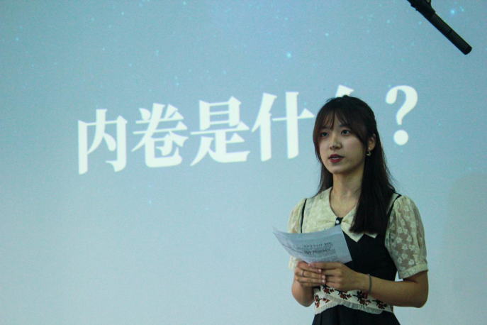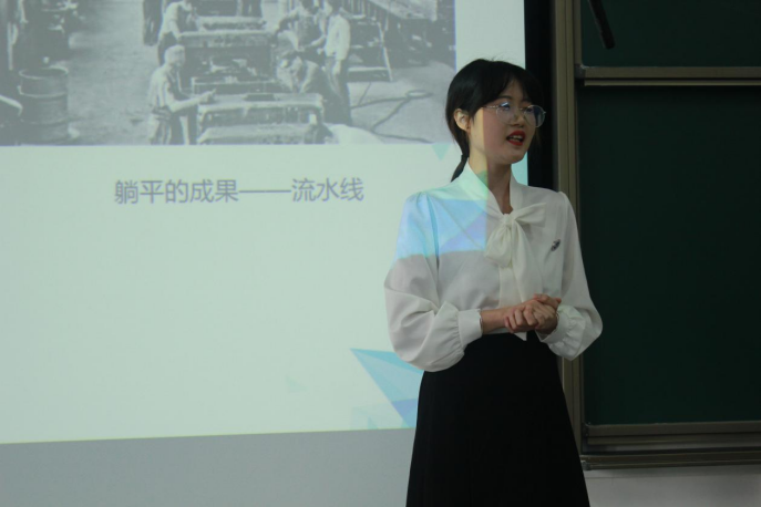 在张伟威的主持下,同学们进行专题演讲。两个班的同学自发组成13个组,每组4—6人,每组派出一名代表上台进行演讲。13个组的演讲各有特色,有的采用朗读的方式,有的采用人物介绍的方式,有的配以音乐,还有的加以生动的肢体语言。同学们围绕着“内卷、躺平、摆烂”三个主题,从不同的角度阐述了本组独特的理解与态度,可谓是形式包罗万象,角度别具一格。比赛过程中,演讲形式生动活泼,教室里始终洋溢着欢声笑语与阵阵掌声。