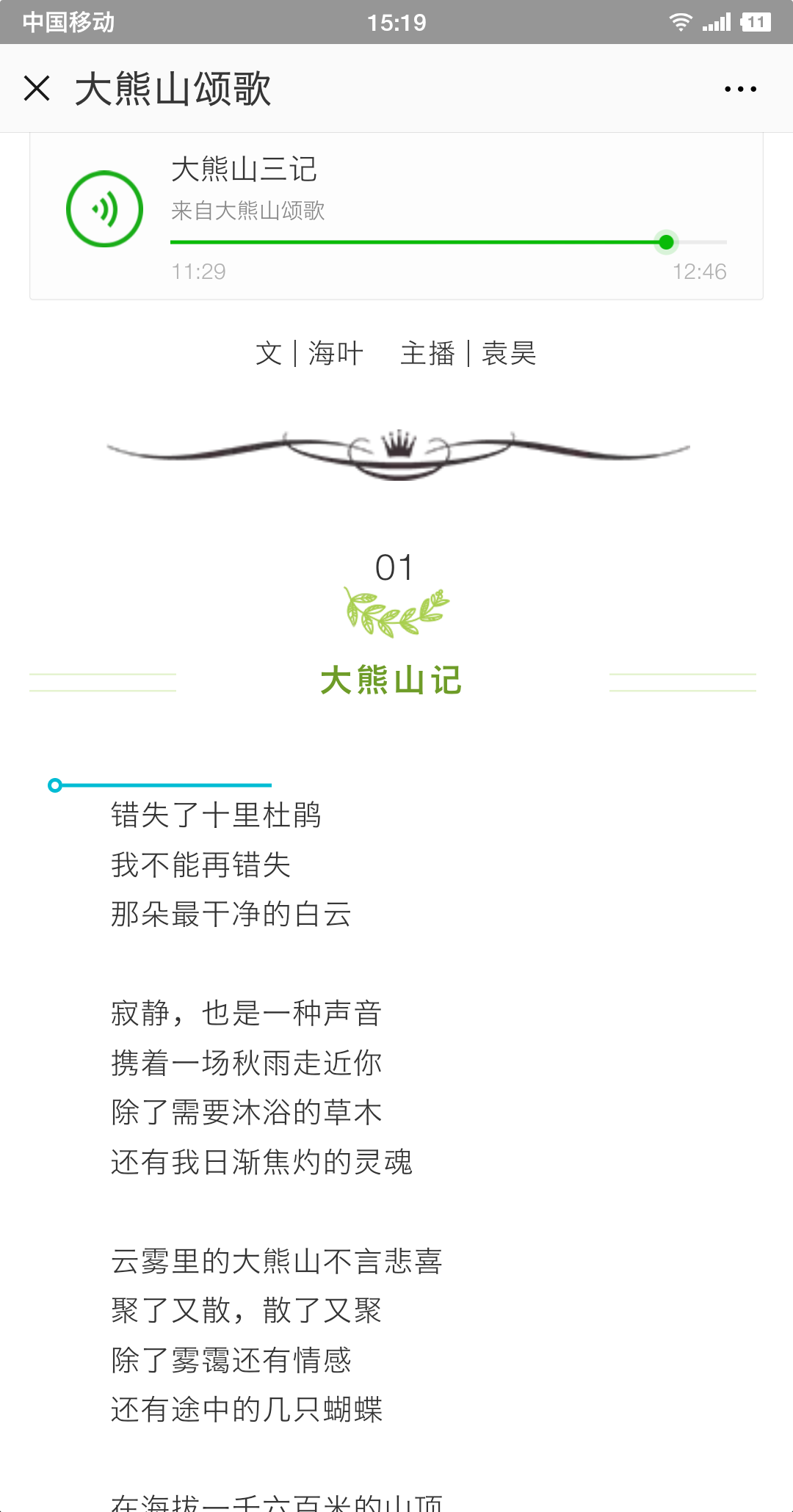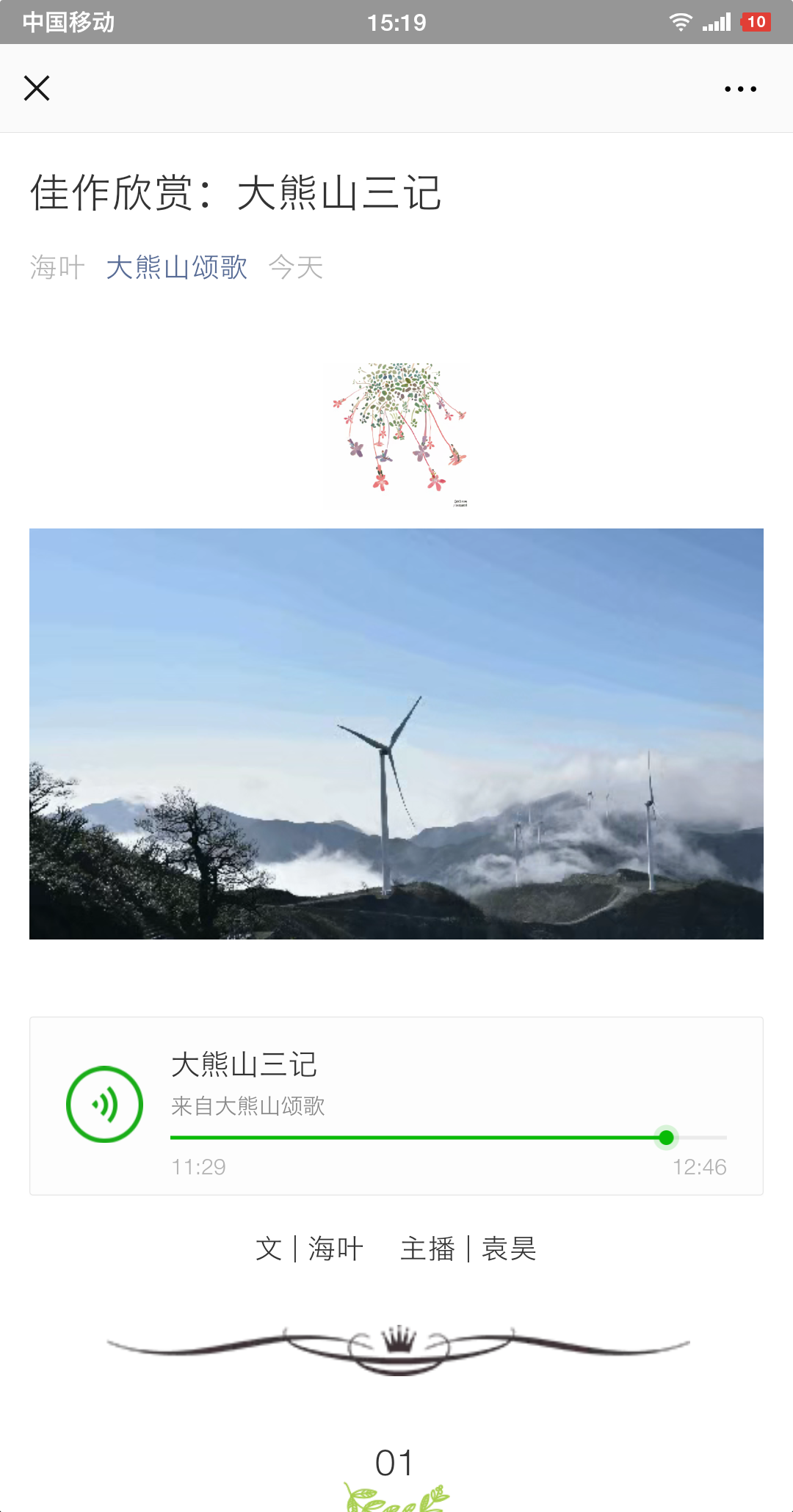 为及时通报征文信息,扩大征文影响力,大赛组委会主任张峰组织学生,创立了“大熊山颂歌”征文微信公众号。遴选出来的优秀征文,及时在公众号“作品展播”栏目推出。在展播文字作品的同时,组织文学院学生袁昊、王胤为优秀作品配乐朗诵。已推出作品四篇,受到网友普遍好评,作品阅读量已近一千人次。