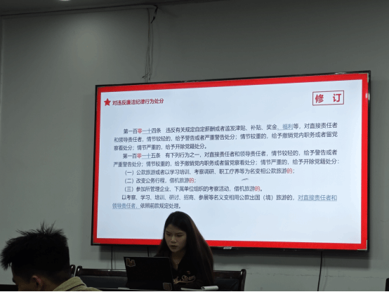 本次政治学习由第一支部齐玉娇同志担任主讲人,以《中国共产党纪律处分条例》为总则,从“深入学习政治理论,强化党纪意识”和“倡导廉洁风气,营造清廉政治生态”两方面对违法犯罪党员和违反廉洁纪律行为的处分进行详细讲解。