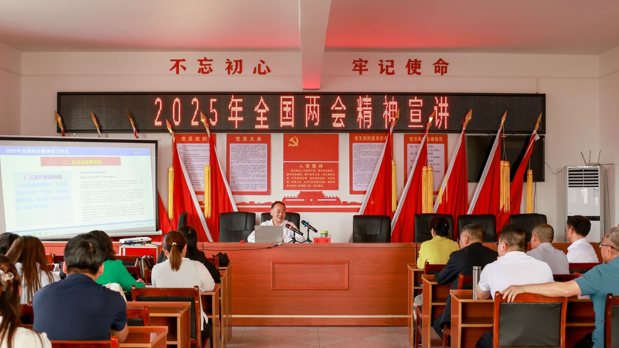 3月26日下午,党委副书记朱强赴学校乡村振兴点灌溪村宣讲2025年全国两会精神。组织部、宣传部、科研与社会服务处、工会4个党支部党员及农业与生物技术学院部分党员,金石镇党委领导,灌溪村村支两委、党员代表及学校驻村工作队等70余人参会。
