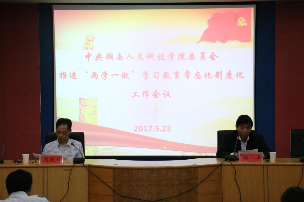 523日,学校在养根楼多媒体报告厅召开推进“两学一做”学习教育常态化制度化工作会议。校党委委员,党总支部书记、副书记,直属党支部、内设党支部书记及党务部门负责人参加会议。会议由党委副书记刘铁铭主持。